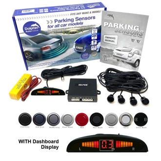 The Dolphin Micro Parking Sensor kit comes with 4 recess mounting sensors. With a Dashboard mounting display with a built-in audio buzzer which gives you a rough indication as to how far you are away from an obstacle. Detection range starts at around 1m and gets you to 30cm at which point you get a continuous tone to alert you to stop.